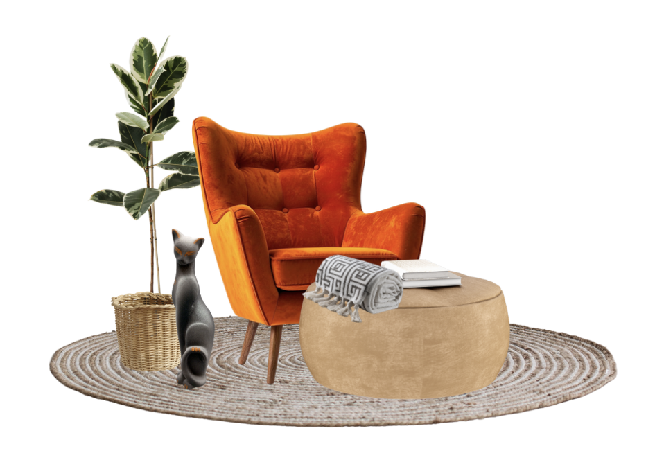 Your items: ottoman, plant, books; Found items: velvet chair, ceramic cat,, throw, basket, rug (total purchases $198)