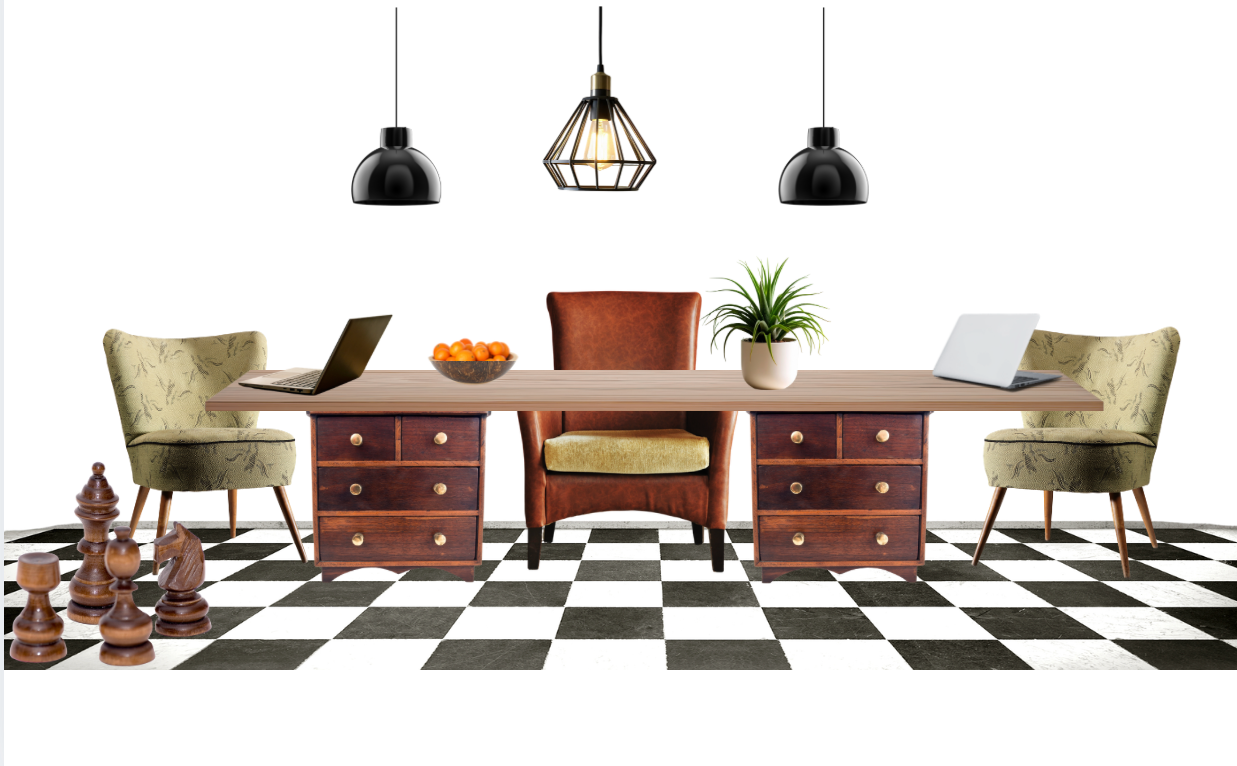 Office Desk + Dine: nightstands do double duty as desk base and dinnerware storage. Push furniture aside for a game of chess or checkers. Seamless design blending work with play.